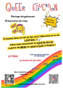 Cette association est née en région parisienne en 2019, elle a été créée par des membres de l’Éduc Nat, iels avaient pour point commun d’être LGBTQIA+, de se sentir isolé·es et peu soutenu·es. L’asso a essaimé ailleurs, d’abord à Lyon puis à ANGERS et bientôt partout!