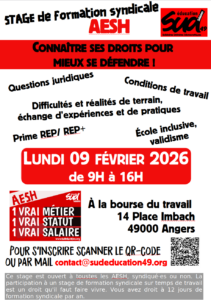 Pour vous inscrire et avoir toutes les démarches à faire, vous pouvez remplir le formulaire suivant https://framaforms.org/inscription-stage-aesh-49-1766064469 ou nous contacter directement à contact@sudeducation49.org. Attention la demande de congé formation syndicale est à faire avant le 9 janvier.
