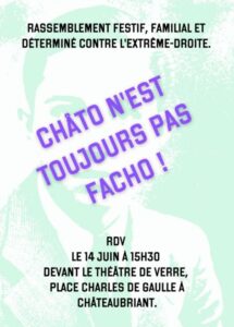 Il y a un an, plus de 500 personnes se retrouvaient pour saluer la mémoire des fusillés de Chateaubriant et appeler à réveiller la resistance à l’extrême-droite. Celleux qui se rassembleront ic le 14 juin incarnent tout ce contre quoi les résistant·es se battaient et ce pourquoi certain·es sont mort·es. Nous refusons de laisser ces néo-nazis faire de Chateaubriant leur terrain de jeu et comptons bien le faire savoir.