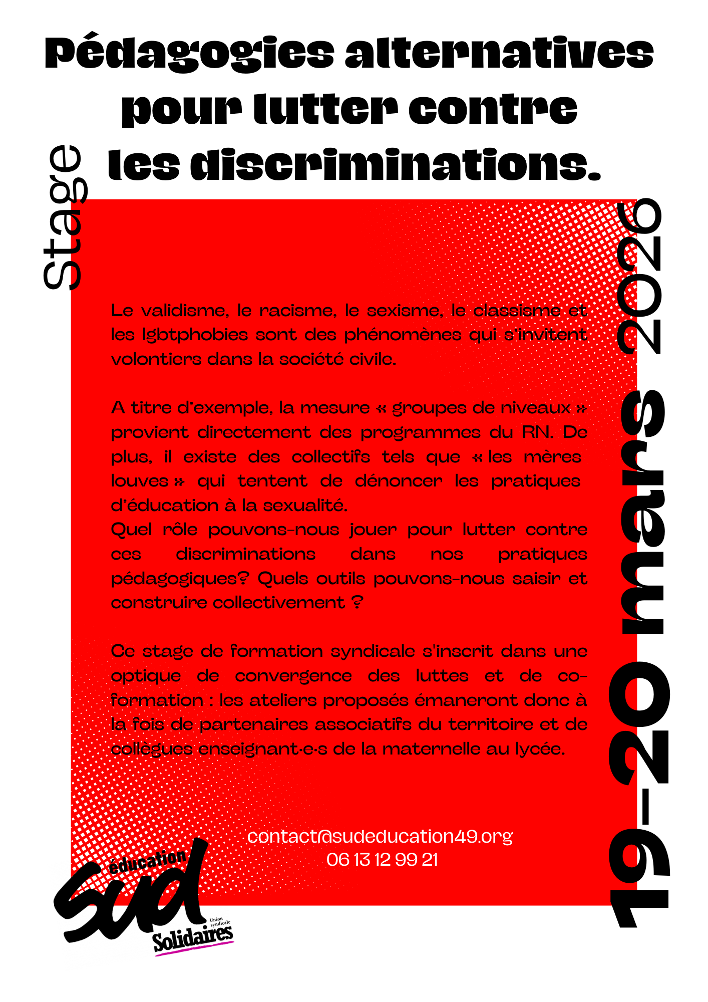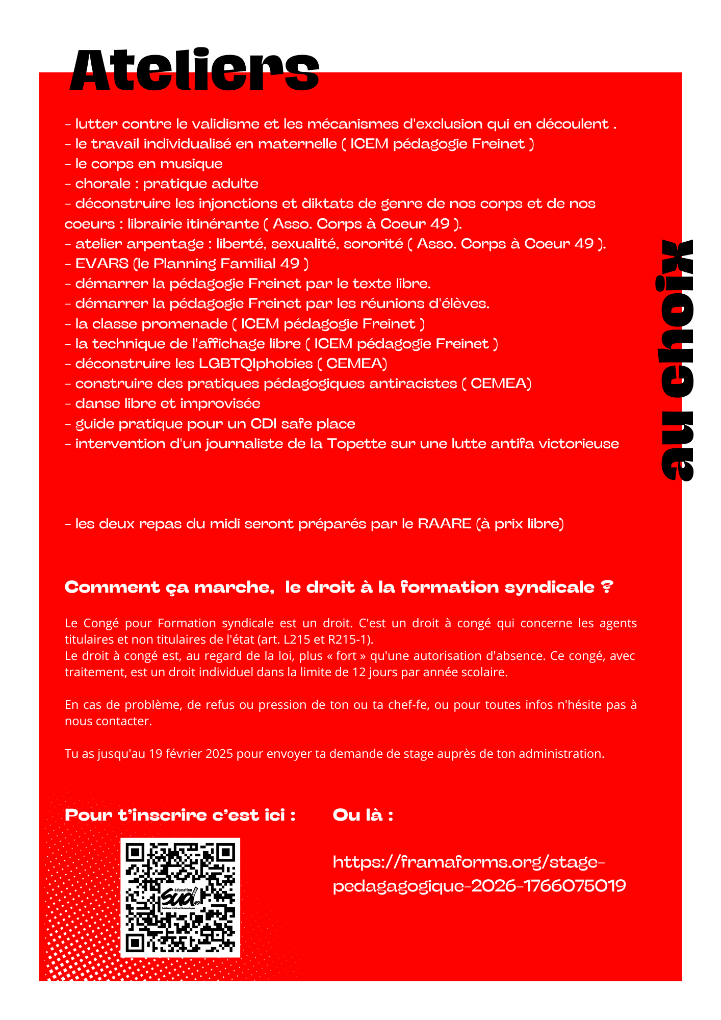 Tu peux cliquer ici pour remplir le formulaire et voir la marche à suivre. Tu peux même en parler à tes potes qui ne travaillent pas dans l'éducation nationale (genre les potes animateur·ices de l'éduc pop ou autre) car le stage est déclaré au CEFI, iels peuvent nous écrire pour savoir comment faire.